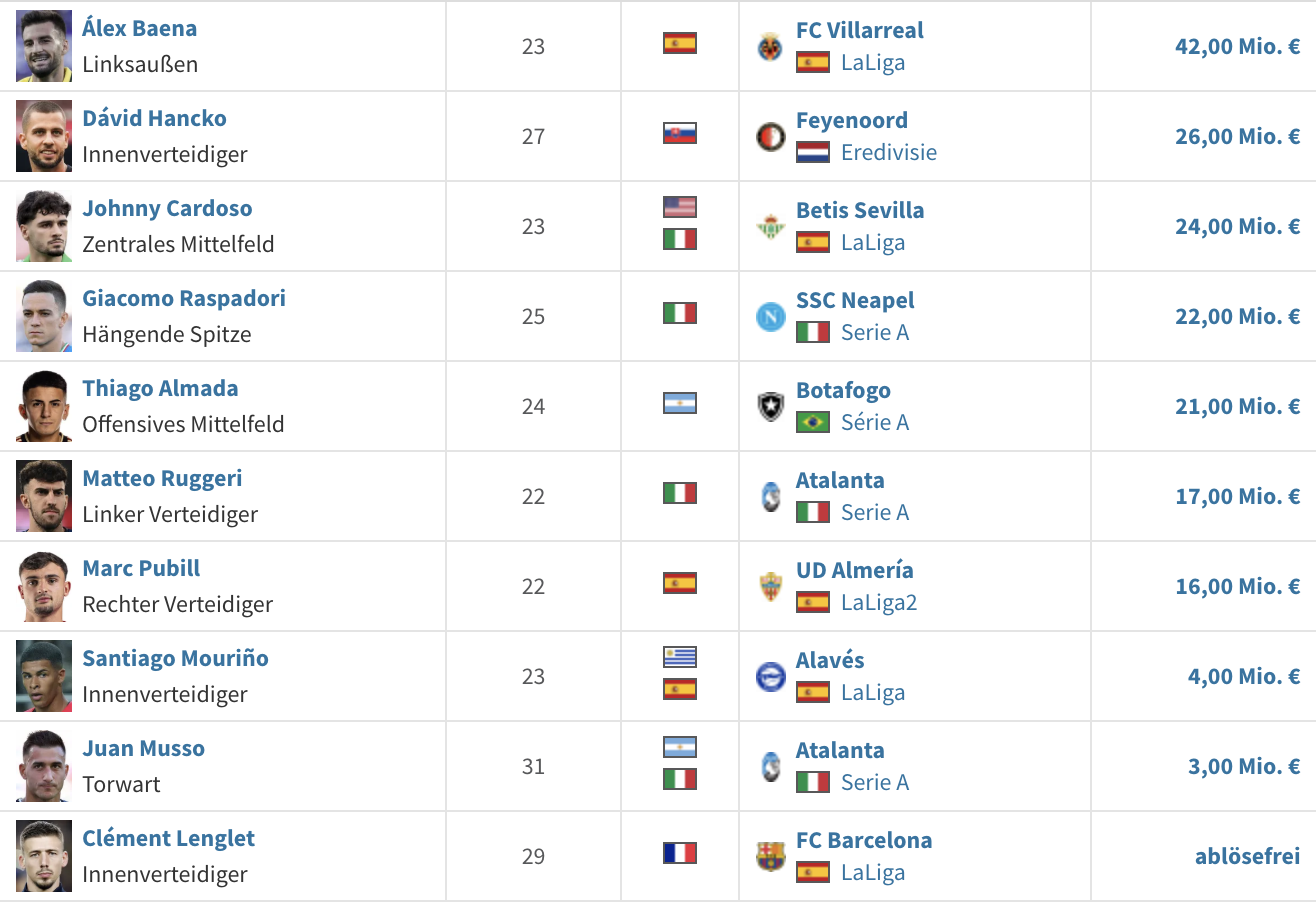 巴埃纳(4200万欧元)、汉茨科(2600万欧元)、卡多索(2400万欧元)、拉斯帕多里(2200万欧元)、阿尔马达(2100万欧元)、鲁杰里(1700万欧元)、普比尔(1600万欧元)、穆里诺(400万欧元)、穆索(300万欧元)、朗格莱(免签)